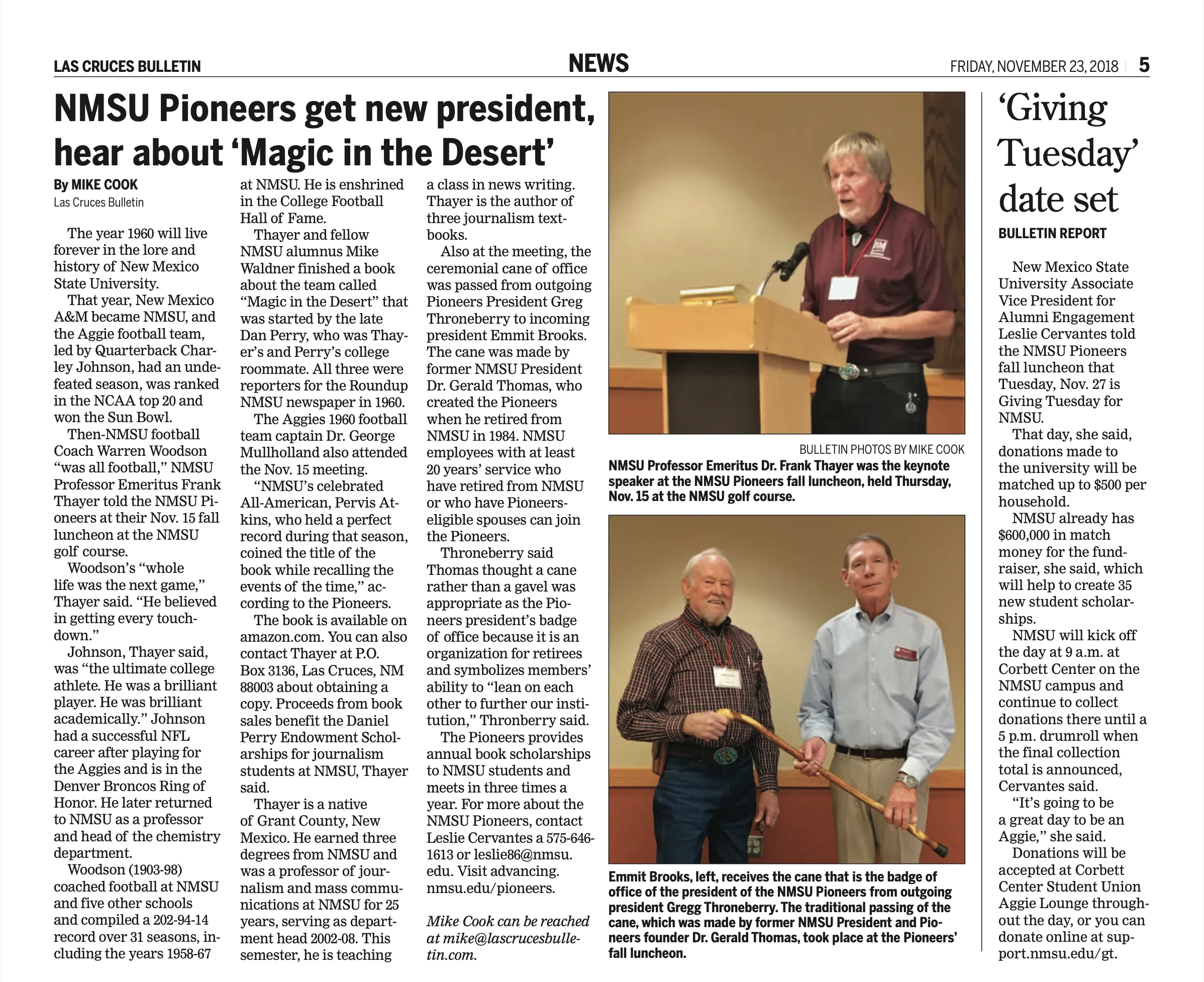 "‘Magic in the Desert’ was the brainchild of Dan Perry, one of my undergraduate roommates. When he died two years ago, NMSU journalism professor emeritus Dr. Frank Thayer, another old roommate, decided to lateral the assignment to me, which is how I became the ghostwriter of the book.
