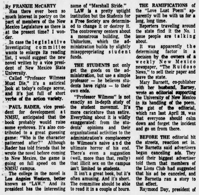 As a side note, there was a John Welborn, sometimes identified as John Wilborn, coaching football at the Artesia high school in the late 1960s while Mike Wilborn was a student there. This John Welborn appears to have been another person. He moved on to become head football coach at other southwestern high schools in the 1970s. Our Bud Wilborn apparently spent his career at the Artesia Junior High, with maybe some special assignments at the high school.