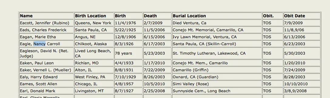 Few records are found of the couple after that. They seem to have settled in the Ventura, California area. No records of children have been found, but there was a Bob Carroll in the Forest Service at that time. Bob passed away in 1987, and Nancy in 2003. She apparently remarried to Edward David Eagle, since she appears in California obituary records as, Nancy Carroll Eagle.