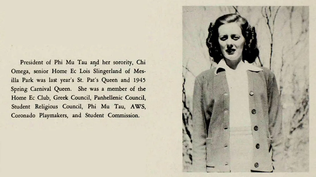 Lois Anderson Slingerland was born Lois Louise Anderson (20 February 1926 to 21 May 2019) in El Paso, Texas. Her father, Elmer E. Anderson, worked at New Mexico A&M, later New Mexico State University, as a poultry and dairy specialist, and Lois excelled there, receiving her degree in Home Economics in 1948 (with honors), even though she was the vice-president of the senior class the year before.
