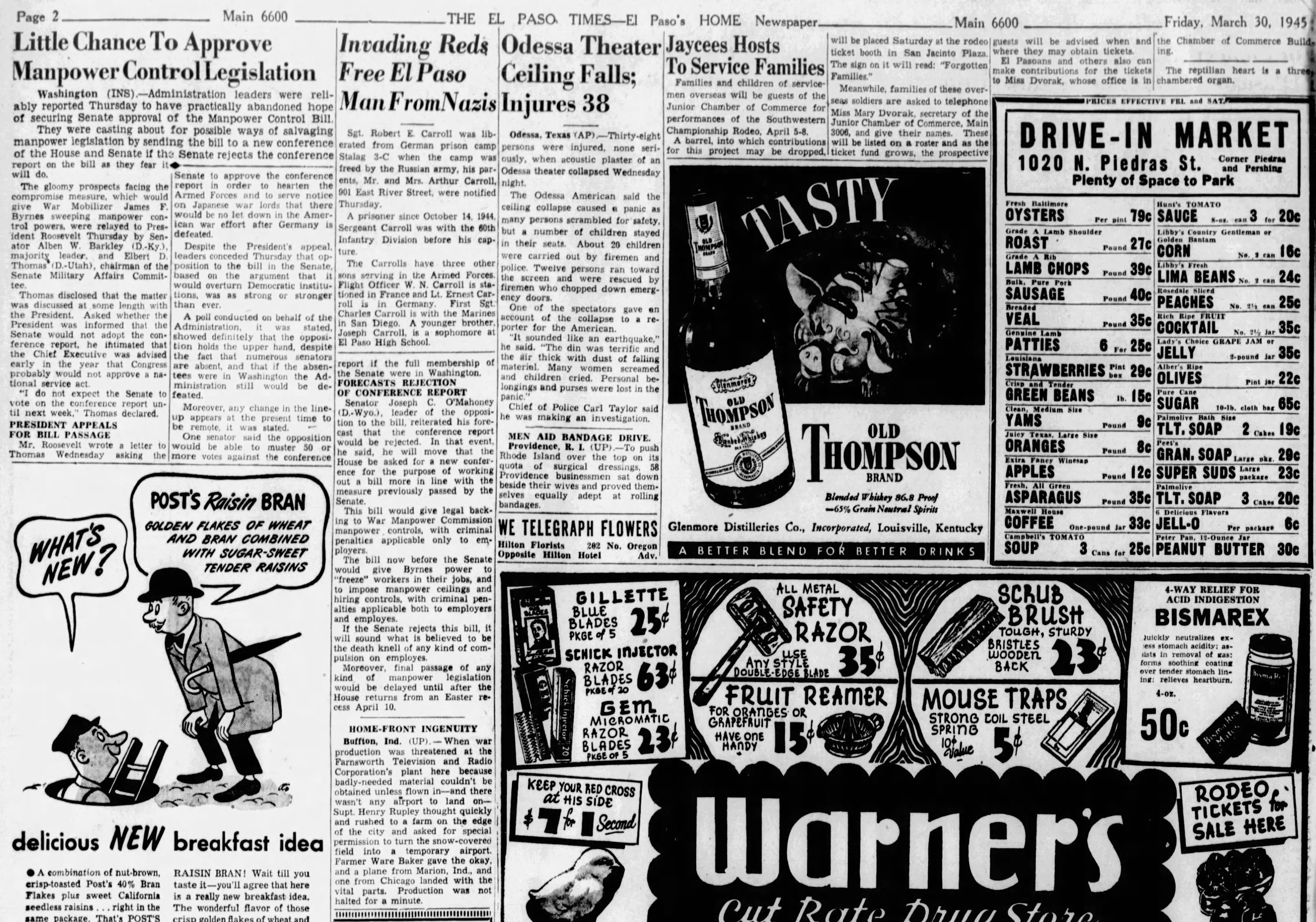Bob started at NM A&M in 1941, a few months before Pearl Harbor. He registered for the draft in June of 1942, was inducted into the Army 17 April, 1943. He was a glider-infrantry sergeant in the European theatre when captured by the Germans' around 19 October 1944. He was held at Stalag 3C Alt Drewitz Brandenburg, Prussia, until liberated by the Red Army on 27 February 1946. His time of capture suggests he was captured during Operation Market Garden in September, 1944. This failed operation was the source of the first American prisoners at Stalag 3C. He returned to New Mexico A&M and completed his interrupted degree in 1947.