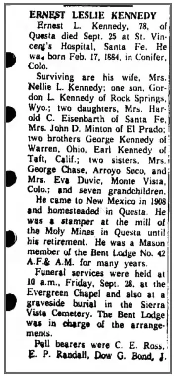 Gordon Leslie Kennedy (27 May 1919- 17 August 2012) was born on his parents' ranch in Sunshine Valley, Taos, New Mexico. He lived in Colorado much of his life, and retired to Phoenix, Arizona, where he passed away.