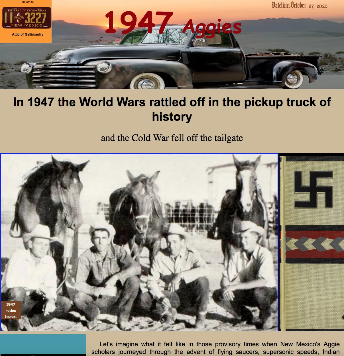 Let's imagine what it felt like in those provisory times when New Mexico's Aggie scholars journeyed through the advent of flying saucers, supersonic speeds, Indian independence, Israel, the death of Winston Churchill, Atomic anxiety, and the gateway to now.