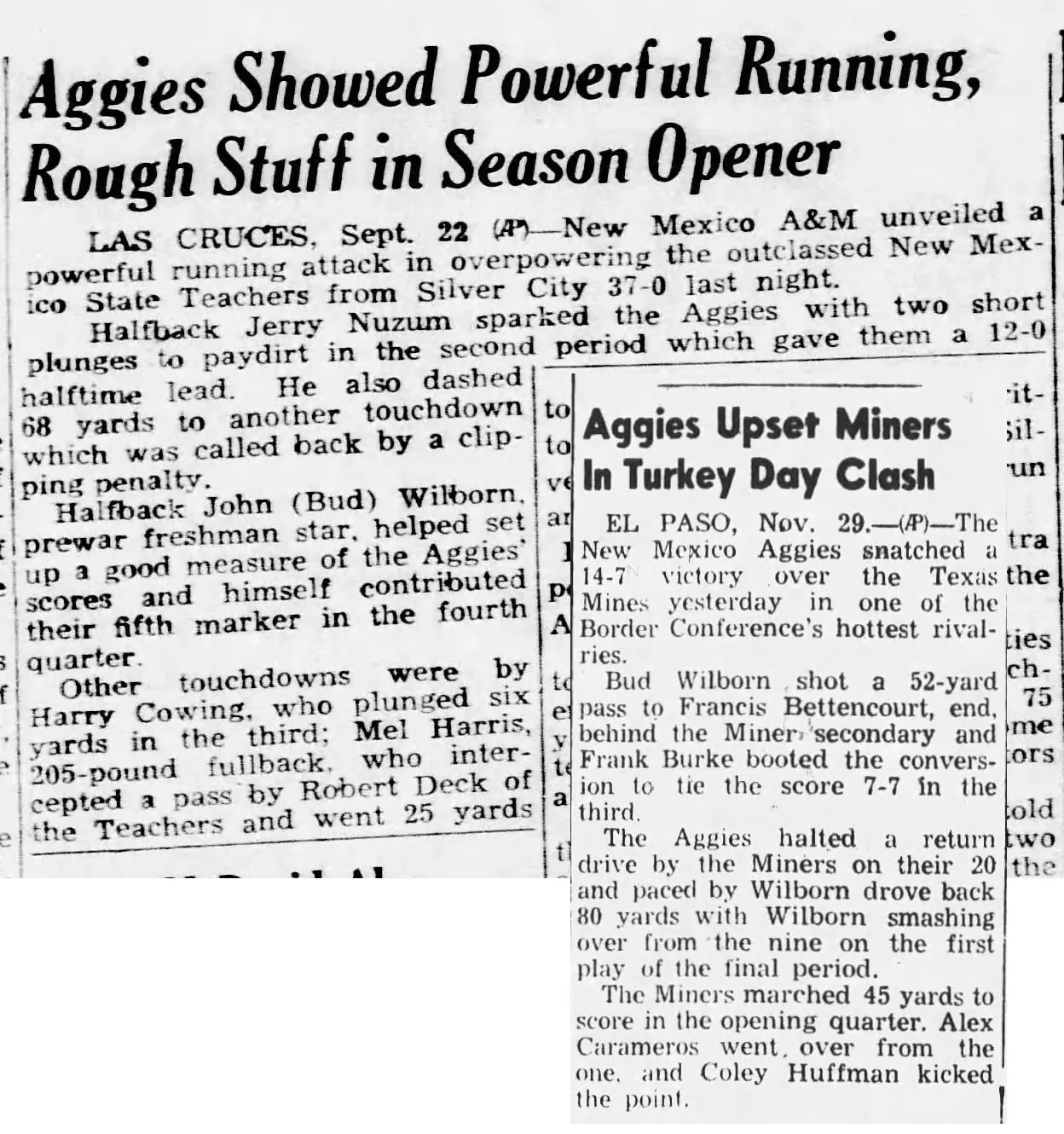 Buddy Wilborn, born John Gillis Wilborn, 29 January 1923 in Alamogordo, NM, was a star football player for the NM A&M Aggies in the early 1940s in his freshman and sophomore years. He joined the Coast Guard after Pearl Harbor and starred on their Berkely California team during the war. While in the service he met a young nurse from Colorado, Susan Townsend, and married her on 16 November 1944.