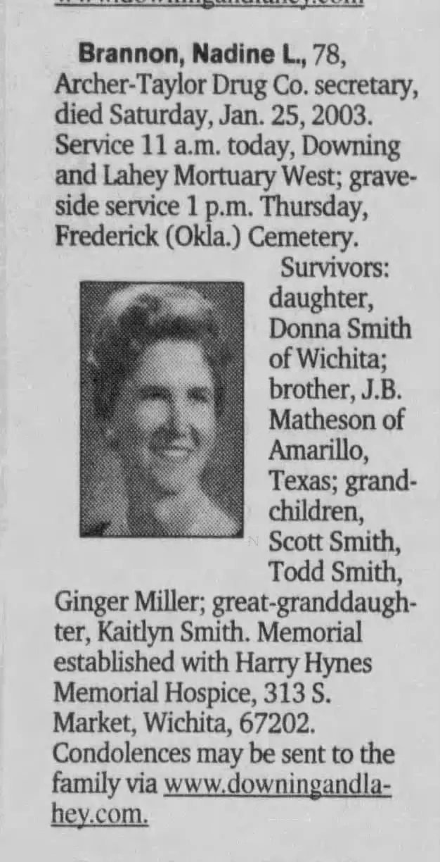 His wife stayed in Wichita, employed as a clerk. She passed away in 2003. His daughter married and had children and grandchildren. We don't know much about any of them, but let's hope one of Billy Bob's ancestors sees this article and helps us with the many missing details of Billy Bob's life. A picture would be nice, but most of all, we wonder if there is any family tradition about Mr. Brannon's last words. "What a beautiful place to die."