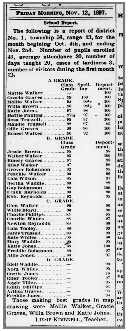 * 1898-Lizzie Kimbrell (1872-1964) was the daughter of George and Myrtle Kimbrell of College Mound, Missouri. She taught at several schools in Macon County from 1893 to 1899 when she married a blacksmith/railroad man, Gavin (Guy) Miller. They lived in Missouri, Texas, Oklahoma, and Alabama, where Gavin died in 1935. Their son, Kenneth, was a journalist and government employee of some note. He died in 1937, and was buried beside his father. The headstone has Lizzie's name on it as well, but she died in 1964 in Oklahoma where she was living with family at the time. There is no record of her teaching after her marriage.
