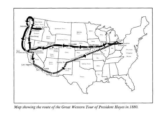 Of all the Hayes' tours, the most dramatic and extended was a western trip to the Pacific Coast and return in the fall of 1880. This marked the first time any President had crossed the continent while in office, although Grant had visited as far as Utah in 1875. The trip, personally nonpolitical in nature with few prepared speeches, allowed Hayes to do something important during his final months in office, and left Garfield's men unhampered in their management of the 1880 Republican presidential campaign. Originally planned for the spring of 1879, the Great Western Tour had to be postponed for more than a year because an extra session of Congress required the President's presence in Washington. Hayes, how- ever, kept in mind the idea of a grand tour as a good way of unifying the nation and promoting pride in America's material progress and future potential. On June 18, 1880, he publicly announced his intention to make a Pacific trip. General William T. Sherman, an old friend, familiar with the terrain to be traversed, laid out the route and methods of travel, an assignment he dutifully performed knowing full well he would have to defer to the President's whims instead of his own preferences on some details. Sherman received help from various army posts and commanders scattered throughout the West. Colonel John Jameson of the Railway Mail Service supervised the day-to-day travel accommodations and kept the accounts. Generally speaking, various railroads provided a director's car for the President's comfort; the travelers stopped at military posts en route and used hotels sparingly, receiving their overnight accommodations and hospitality as a courtesy of army generals or well-known businessmen