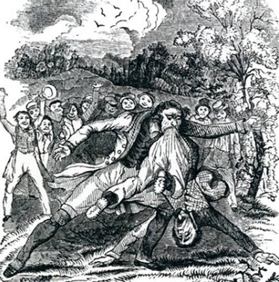 They stripped themselves of all clothing except their underclothes, and stepped into the ring, and went to knocking. They knocked in good earnestness for a long time. It was “so good a man, and so good a boy,” as the saying was, John’s friends hollowing for him, and Kerby’s friends hollowing for him. After they had fought for quite a while, both were as bloody as they could be about their faces and from their waists up. I told those standing by to see that I showed no foul play as I reached over the ring and took a clot of blood out of John’s nostrils. This appeared to revive him very much, for his nose was so stopped that he could not breathe through it. I saw that Kerby was beginning to weaken, and some of his friends proposed that we part them, but I raised my handspike and told them that I would ’brain’ the first man that interfered, for they were fighting to decide which could whip, and that it had to be decided. They fought a while longer, and at last Kerby told them to take John off, that his wind was too long for him. Both were just about exhausted, and consequently it was not a hard job to separate them. John tried to jump up and hollow, but I don’t think he raised both feet off of the ground, and said that he was the best man.