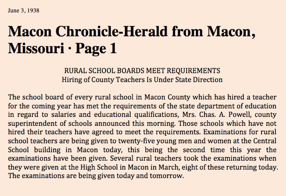 Not much has been discovered about required teacher qualifications. All for which information is available have been at least high school graduates. Many had some college, most often from the teacher's college in Kirksville, which operated under many different names over the years. This announcement appeared in 1938, and might imply that whatever the requirements, they might not always have been met. The use of exams in place of credentials is also implied.