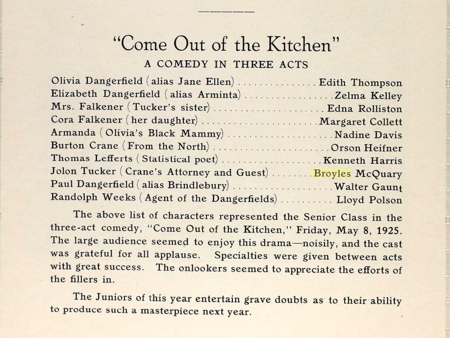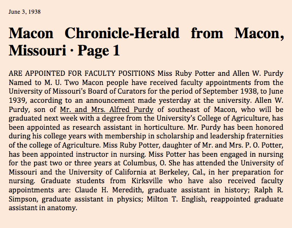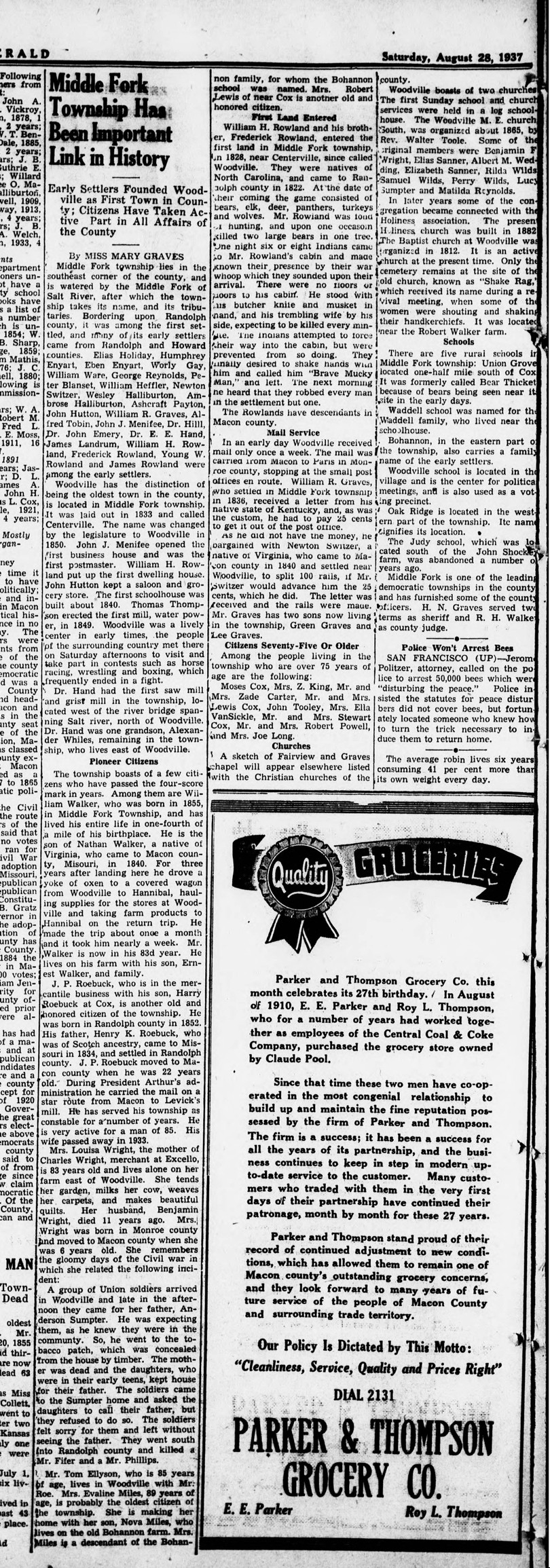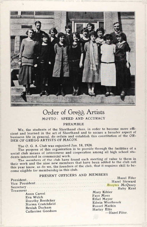 * 1925-There were several Otis McQuarys in the area, and at least one Broyles McQuary. The McQaury that taught at Bohannon is probably Broyles Sumner McQuary (1904-1993) of Macon, and later Dexter, Missouri. The Macon Republican identifies the Bohannon teacher as Broyles McQuary, and the Macon Chronicle-Herald identifies him as "Otis" McQuary. There were several men named Otis in the McQuary family, and it's possible Broyles McQuary was