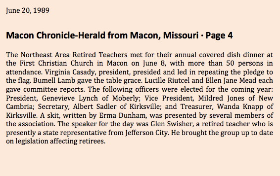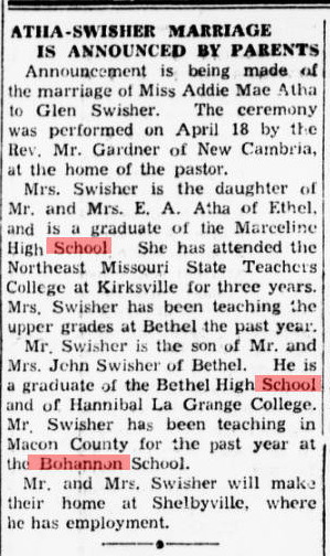 * 1941: Glen M Swisher (1920-1999) was born in Bethel, Missouri, a small town north of Shelbyville. He graduated from Bethel High School, and Hannibal La Grange College. After his stint at Bohannon, he married Addie Mae Atha of Ethel, Missouri, and then joined the the Navy for World War II. He went on to a career in teaching (we don't know where), and later went into the Missouri State legislature. The Macon Chronicle-Herald documents his year at Bohannon with this brief announcement from, April 23, 1941, "Glen Swisher closed his term of school at Bohannon Friday." He is buried in Centertown, Missouri. Interestingly, the announcement of his hiring at Bohannon called him Earl Swisher, for reasons unknown. Just before Glen Swisher's term began, the paper reported: George Rowe built a new flue at the Bohannon school house.