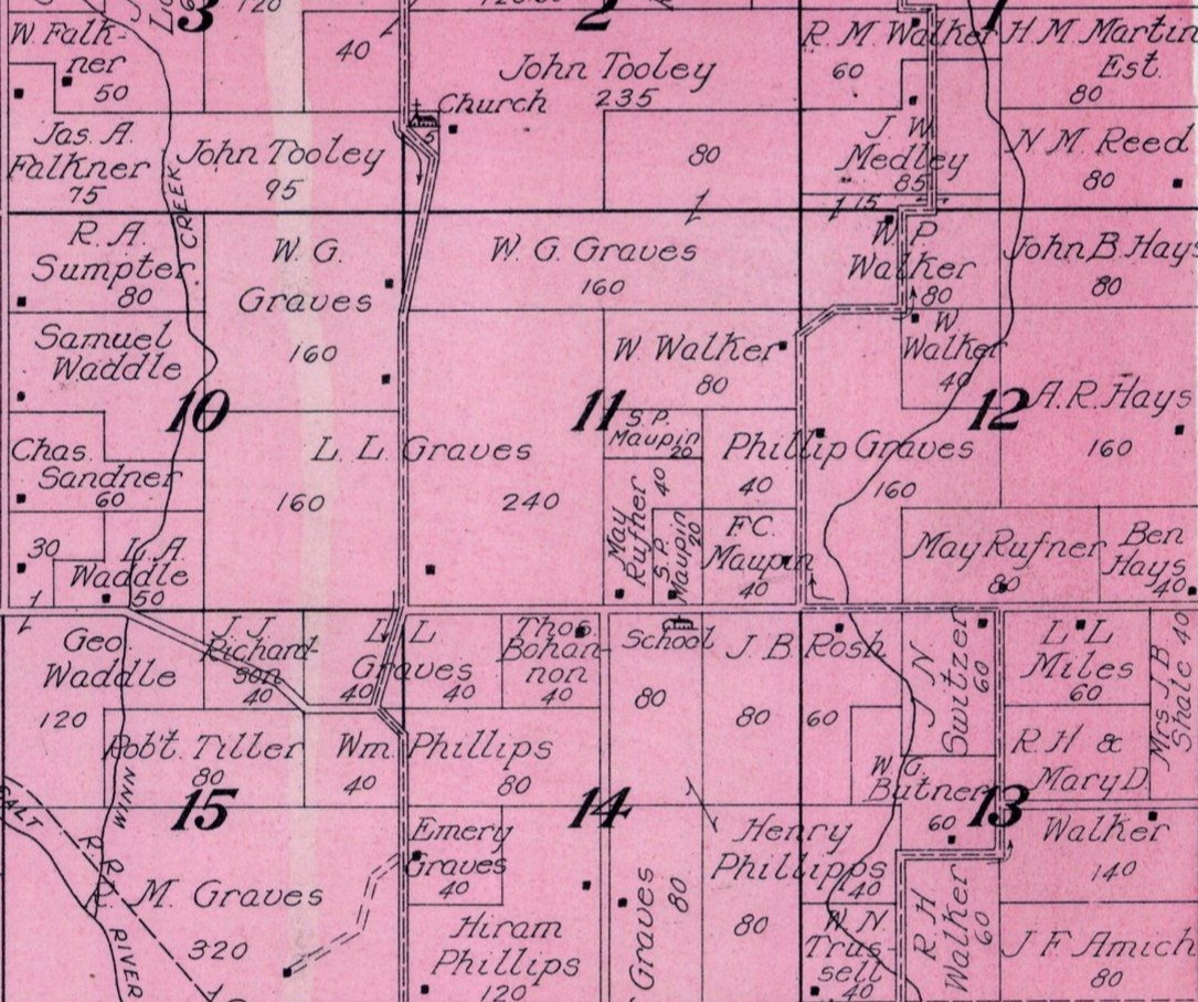 * 1901-Miss Luella Walker was almost certainly Susan Luella Walker (1878-1966), identifed in the 1900 census as being employed as a school teacher, boarding with the Simon Maupin family, across the street from the Bohannon School. She married Alfred Purdy in 1903, and made her home in Narrows Township, Macon County, Missouri. Her son, Allen, was appointed to the faculty of the University of Missouri in 1938.