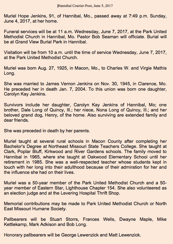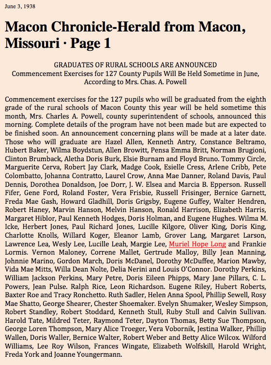 * 1943: Muriel Hope Long (1925-2017) was the daughter of Charles W Long, and Virgie May Long of Middle Fork Township, Macon County, Missouri. Charles and Virgie were long time residents and members of the Bethlehem Church, a rural church in Macon County. Miss Long attended the Waddell country school. Frequently on the Honor Roll, she graduated the eighth grade in 1938. In 1945, about a year after her tenure at Bohannon School, she married James Vernon Jenkins in Clarence, Missouri. She graduated from Northeast Missouri State Teachers College, and taught at several schools, moving to Hannibal, at some point.