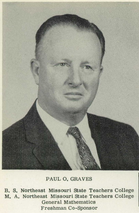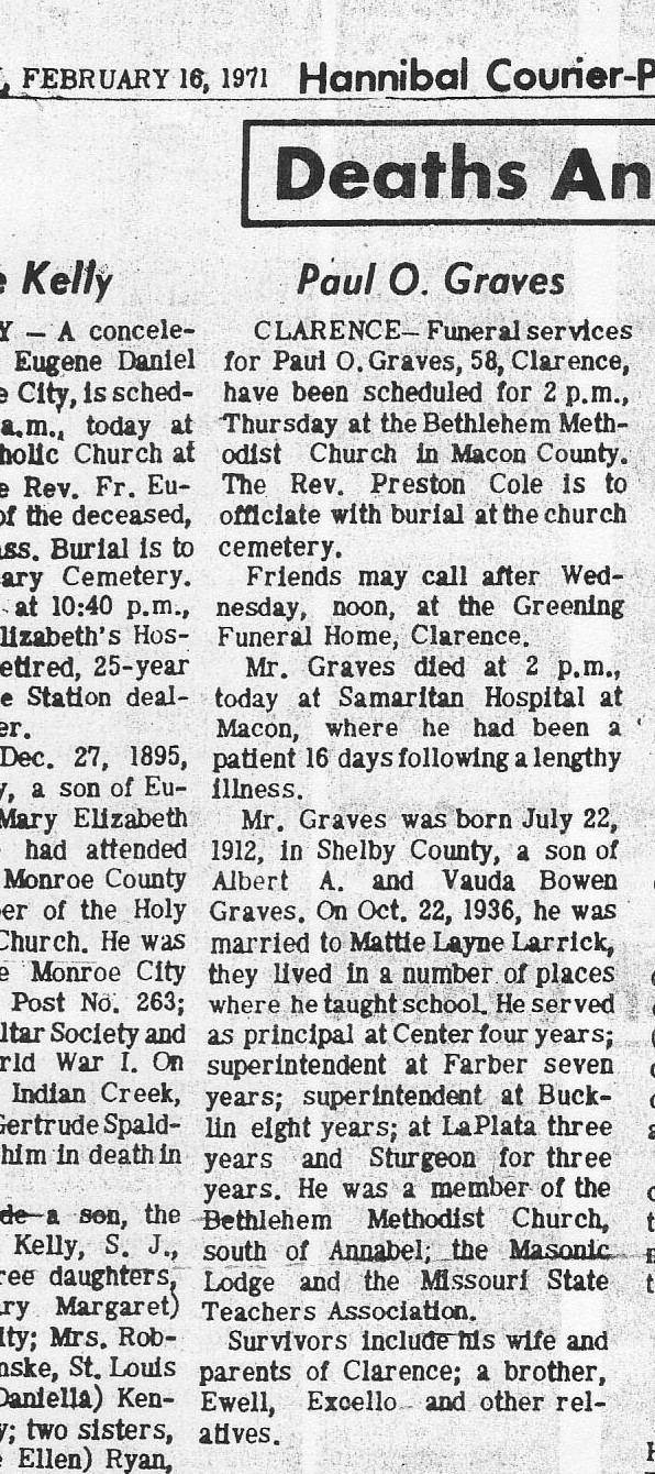 The memorial on the Find-a-Grave website says, "Paul was school superintendent at the Bucklin, Mo High School. He also was employed by the LaPlata, Center, Farber, and Sturgeon schools. He is survived by his wife Mattie Layne Graves, his parents Mr and Mrs Albert A Graves, brother Ewell, and other relatives." The picture at right is from the Bucklin High School 1958 Annual. His obituary appeared in the Hanibal Courier.