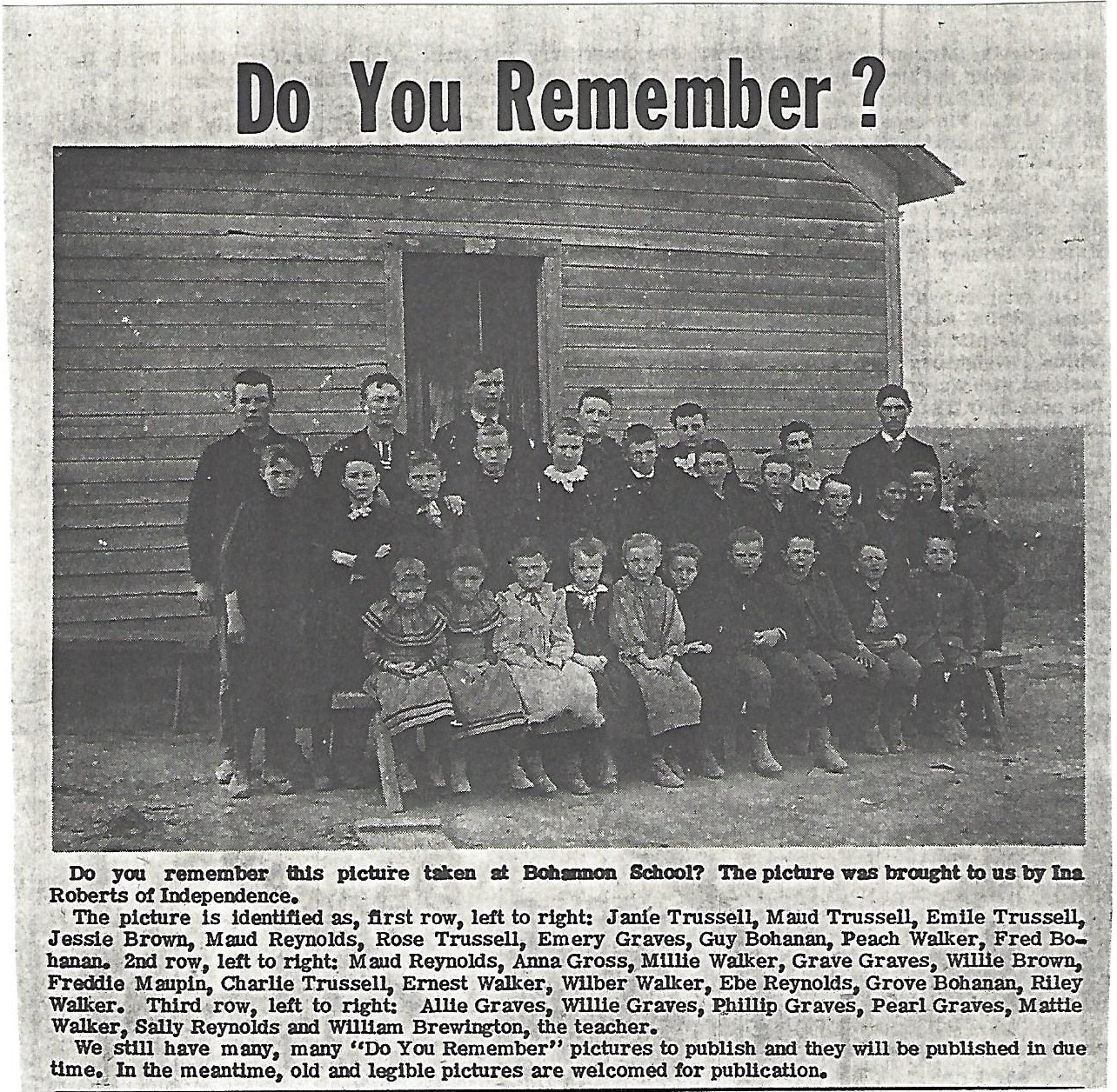 * 1896-Thomas Leonard Irvine (1858-1943) was the first teacher of record at Bohannon School. The Macon Republican of May 21, 1897, tells us, "Thomas L. Irvine has been employed to teach the winter term of school in Woodville. Mr. Irvine has taught two terms in succession at the Bohannon school, and comes well recommended as a teacher." This means Mr. Irvine's tenure at Bohannon began in September, 1896. The same paper for February 19, 1897, said, " Mr. Irvin will teach the Bohannon school this spring."
