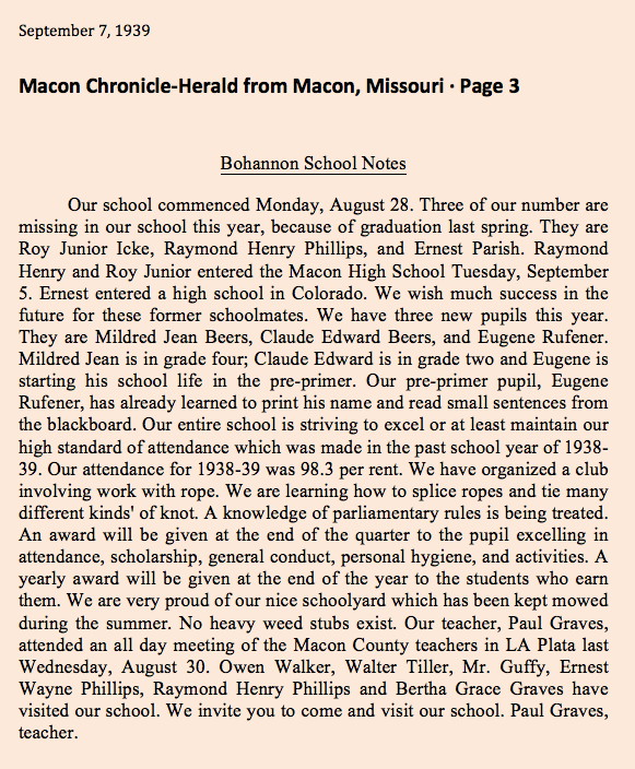 * 1934,38,39,40-Paul O Graves (1912-1971) was the son of Albert Graves, the brother of Mary F. Graves, future superintendent of schools. Whether she was involved in his hiring is unknown. The Macon Chronicle-Herald, November 19, 1933, confirms his presence at Bohannon and gives some student names announcing the spelling honor roll for rural schools. "Bohannon, Paul O. Graves: Vera Phillips, Raymond Phillips, Ernest W. Phillips, Earl Amick and Junior Icke." A pie supper announcement in the same paper from 1931 indicates he was teaching at the Waddell rural school in the 1931-32 school year. We know he was at Bohannon for the 1939-1940 school year, and had been there the previous year, from an announcment in the Macon Chronicle-Herald of September 7, 1939.
