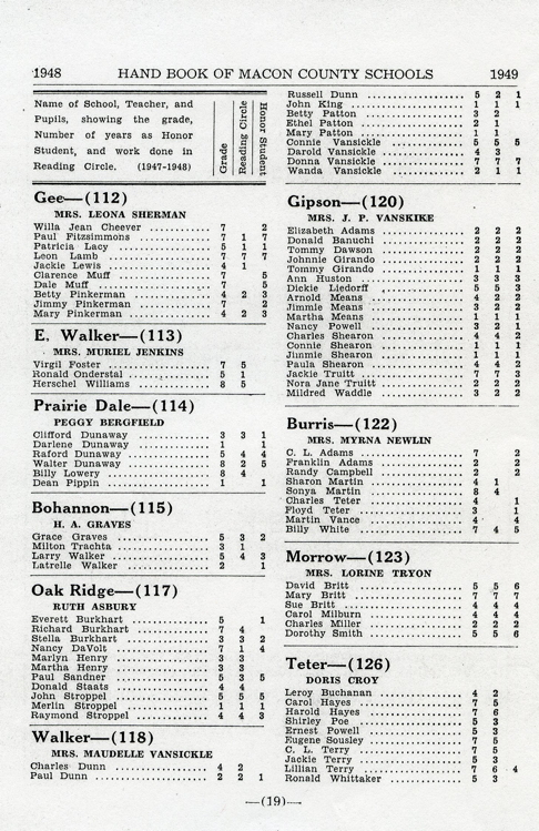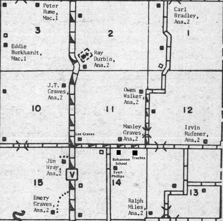 This page from the Macon County Handbook gives us the names of teachers, and some pupils from Bohannon, and surrounding rural schools. In the years between 1949 and 1953, when the Trachta children attended Bohannon School, the student population averaged around 15 to 20.