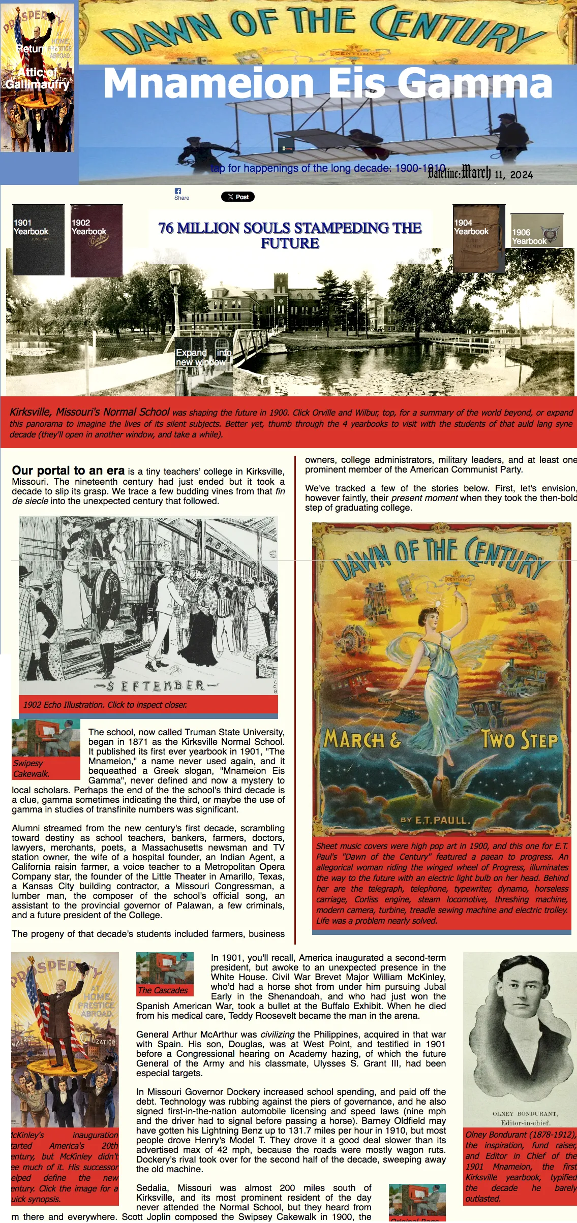 Our portal to an era is a tiny teachers' college in Kirksville, Missouri. The nineteenth century had just ended but it took a decade to slip its grasp. We trace a few budding vines from that fin de siecle into the unexpected century that followed.