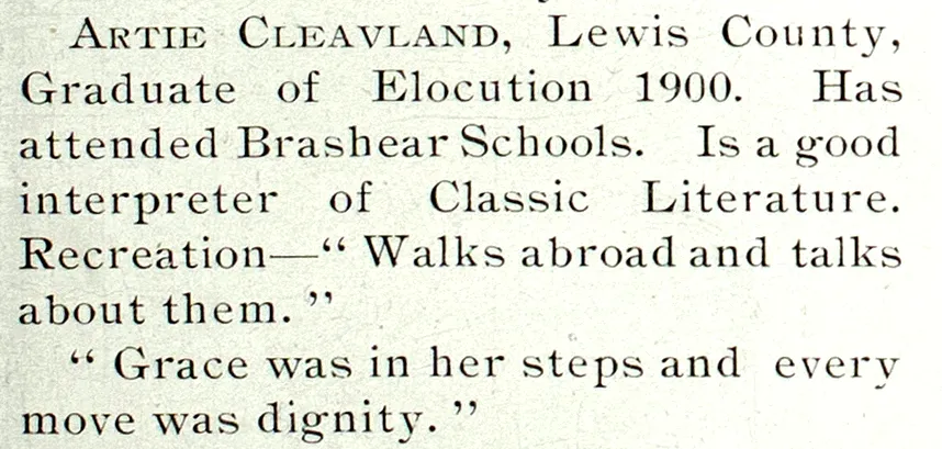 Artie Cleaveland's name was spelled with an embedded "a" by the 1901 yearbook and like the president's in 1902. The census used the a-less spelling, but in 1959 she returned from London on the Pan Am Clipper, and her name, presumbably from her passport, was spelled, "Cleaveland, Artie K." Social Security also used the "a" spelling, as well as some legal proceedings in 1953. Hmmm. The 1902 yearbook, the source of her picture, also tells us she was teaching in Monticello, Missouri.