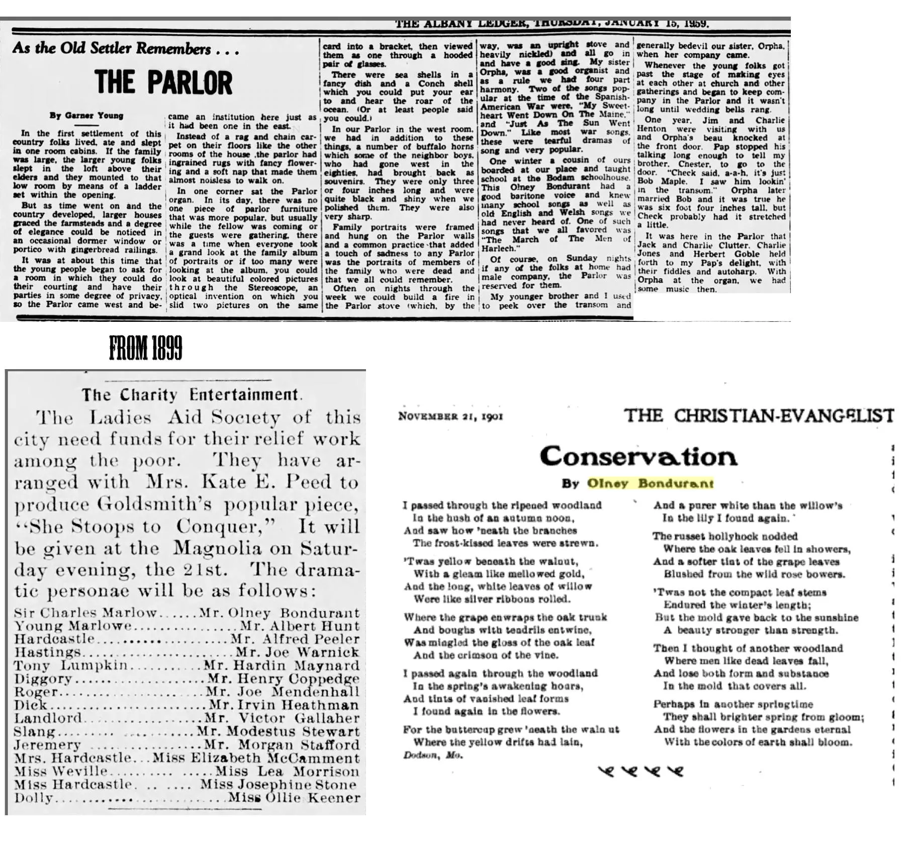 Olney's sister, Lura Maude Bondurant, is probably the Maude Bondurant (or Bon Durant, as the editor insisted), showing prominently in the 1902 Echo, the replacement name for Olney Bondurant's "Mnameion." She later graduated from the Normal School in Warrensburg, Missouri before launching her own teaching career. She lasted longer than her adventuresome brother, spending several years in Oklahoma, where she graduated from teaching rural schools to teaching teachers in an Oklahoma Normal School. She completed her career in Los Angeles, where she died in 1960. Neither she nor Olney ever married.