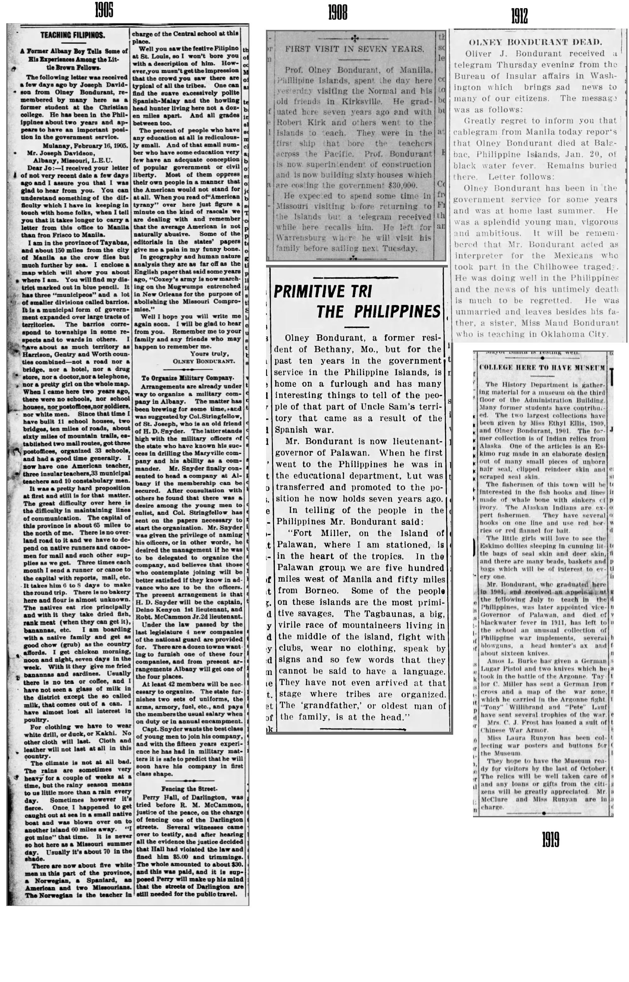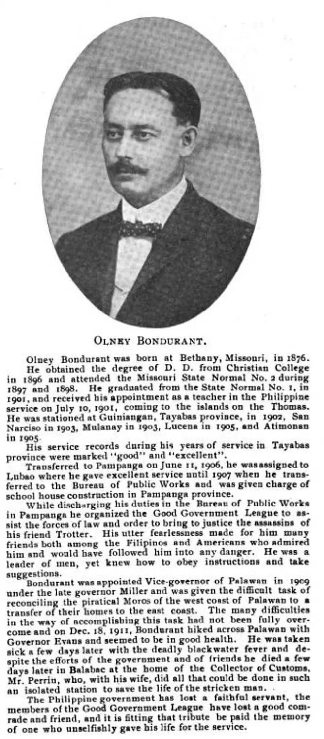 " The provincial service of Palawan and the special province service in general met with a serious and deeply regretted loss in the death of the assistant to the provincial governor, Mr. Olney E. Bondurant, caused by pernicious malarial fever. He died at Balabac on January 20, 1912, soon after his return from the United States. Mr. Bondurant had immediate charge of southern Palawan, the territory under his jurisdiction including all of the Moro and most of the Tagbanua country. He had rendered very important service in connection with the moving of renegade Moros from the west coast, and had made rapid progress in the establishment of helpful and friendly relations with both Moros and Tagbanuas. He was a fearless, tireless, efficient officer. Even when attacked by illness which ended his life he refused to give up, but rendered service in the field on the day of his death. His death was keenly regretted by many of the unruly Moros whom he brought under Government control and whose interests he carefully safeguarded as long as he lived."… From: Report of the United States Philippine Commission to the Secretary of War, pp. 80-81.