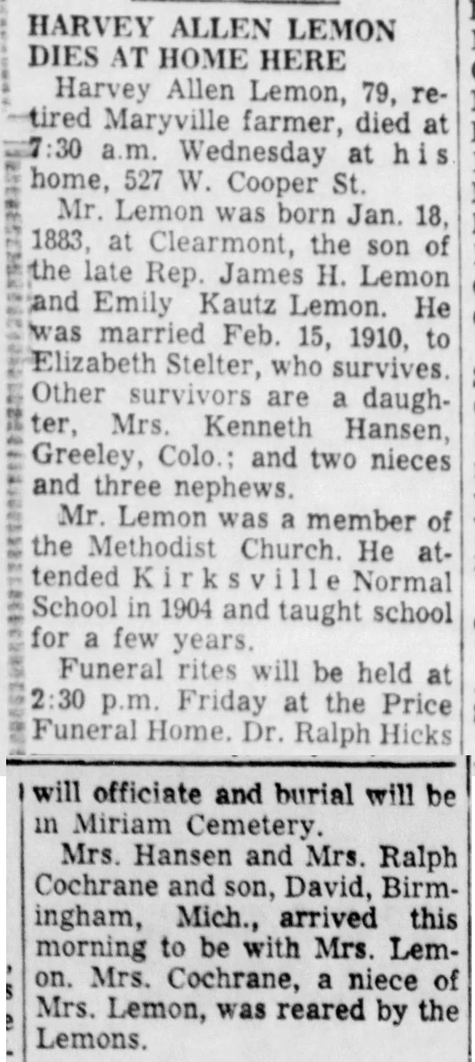 Death: June 12, 1961, Kirksville, Adair County, Missouri