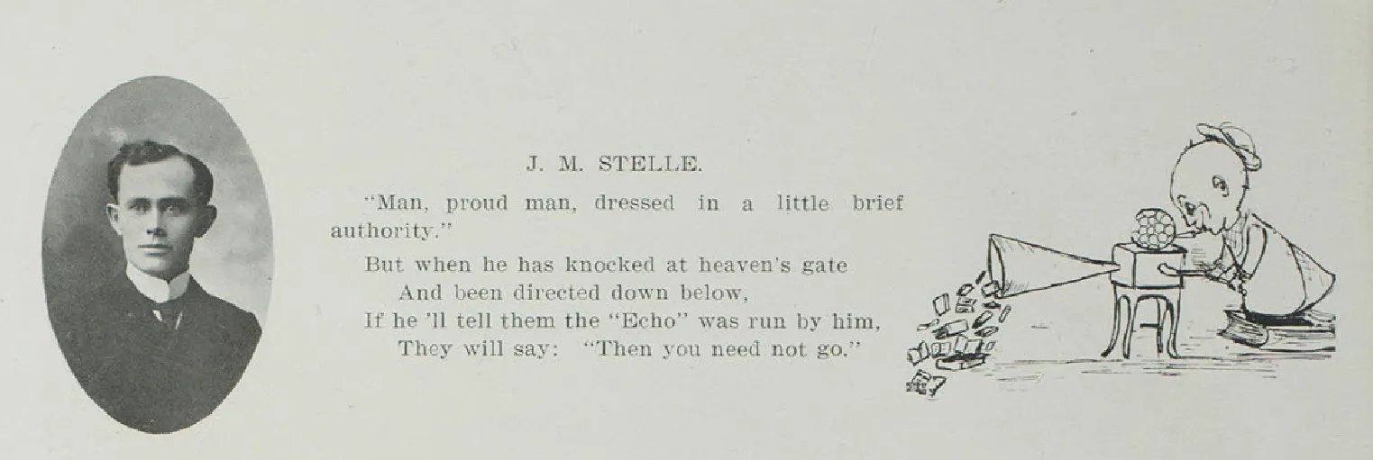 Eugene Monroe Violette, Professor of History, at the Kirksville school while Bondurant was there, credited him, in his history of the Kirksville Normal School, published 1905, as having conceived, edited, and largely financed the Mnameion, the first ever yearbook. We can't confirm, but can speculate, Bondurant probably also named it, and perhaps coined the slogan, Mnameion Eis Gamma. The meaning of this Greek phrase was probably well understood at the time, but by 1998, the yearbook recounted the history of student publications, and included this translation: "…the record or remembrance of a person or thing." Perhaps it was understood at the time as a remembrance or memorial, and the slogan probably suggested a memorial into eternity. If so it seems a marvelous title, and sentiment, but was discarded the following year for the more prosaic "Echo" which continues into the present.