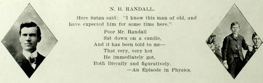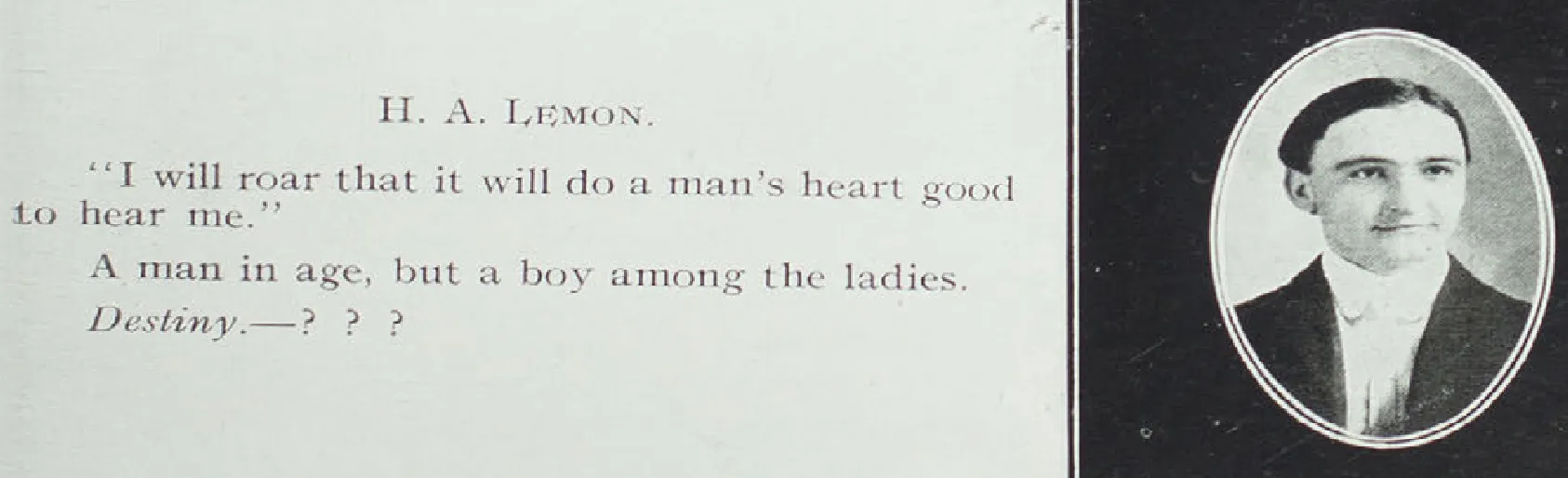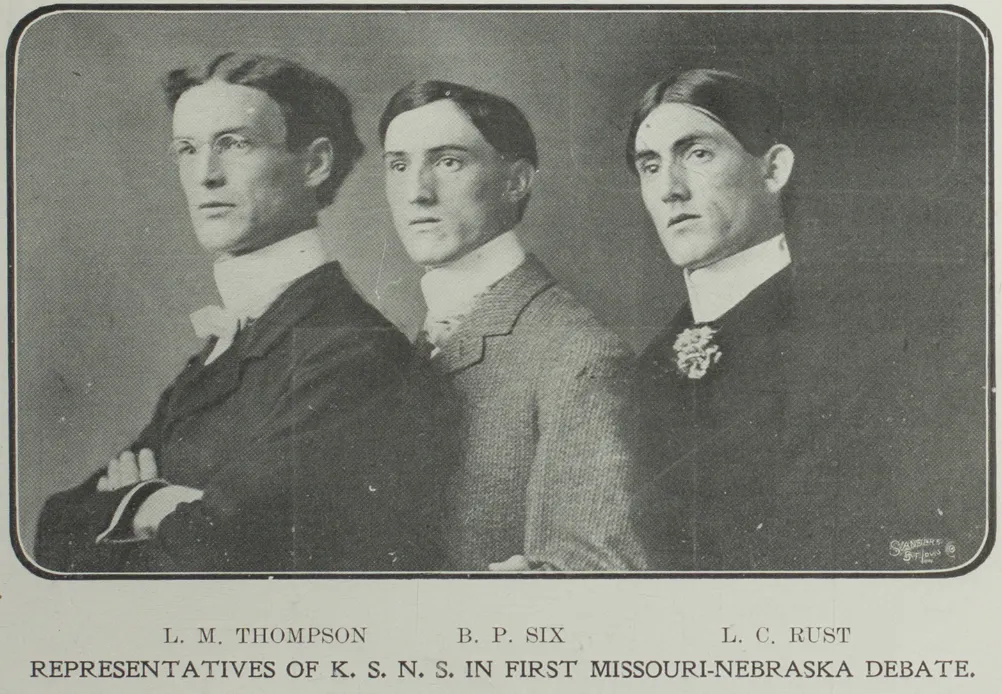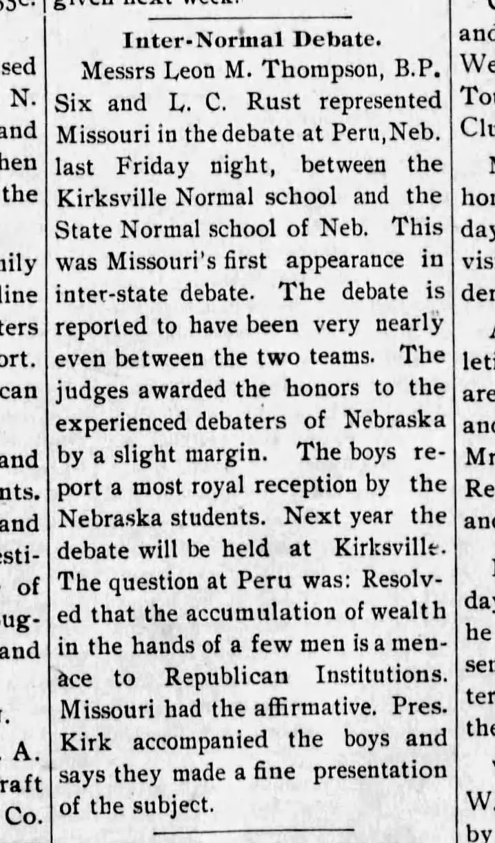 He taught school prior to his Normal School stint, and seems to have left postitive impressions wherever he went. One old timer from Albany, Missouri, reminiscing in 1959, remembered he, "Had a good baritone voice and knew many school songs as well as old English and Welsh songs we had never heard of..." including..."The March of the men of Harlech." At Kirksville he played basketball, triumphed in debate, was praised for his writing, and, by force of will, founded the school yearbook.