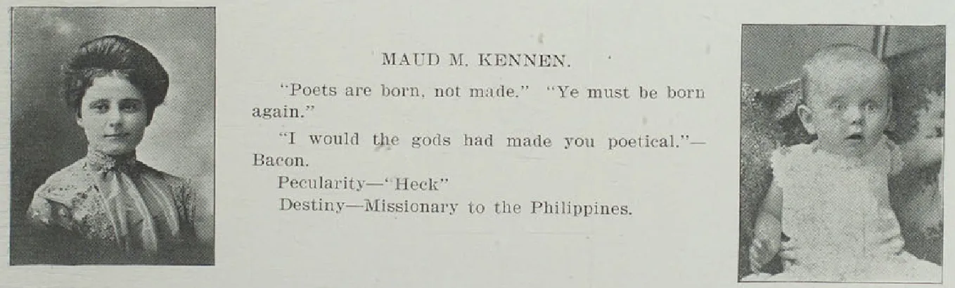 It's interesting to note both John R. Kirk, the school president, and Olney Bondurant, the first yearbook editor, were from Bethany, Missouri. Kirk taught school in Bethany, in addition to being the state high school superintendent. Bondurant gave Kirk a highly positive biographical sketch in the 1901 yearbook. We can only speculate about any friendship between the two, and any role it might have played in Bondurant's yearbook success, and his selection for duty, along with Kirk's son, in the Philippines. If Bondurant and Robert L. Kirk had any interactions in the Philippines they have eluded the records we've seen.