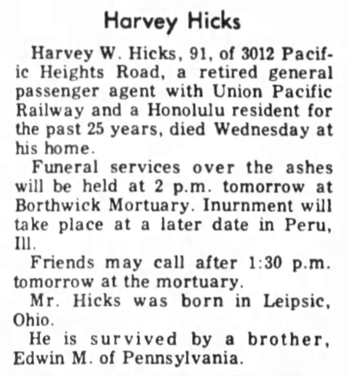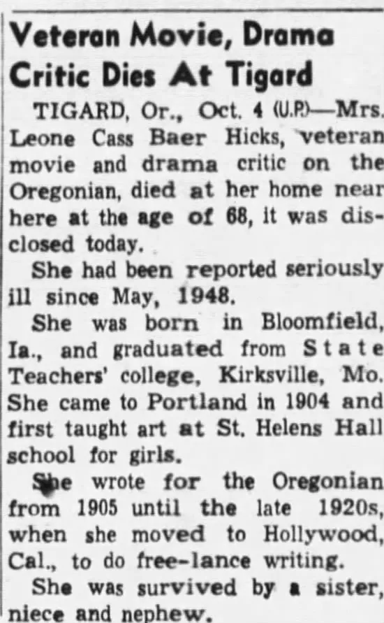 By 1923 she moved with her husband to Hollywood, California where he continued working for the railroad and she did freelance writing. She returned to Oregon and passed away in Tigard in 1949. Hicks retired and moved to Honolulu, Hawaii where he passed away in 1977.