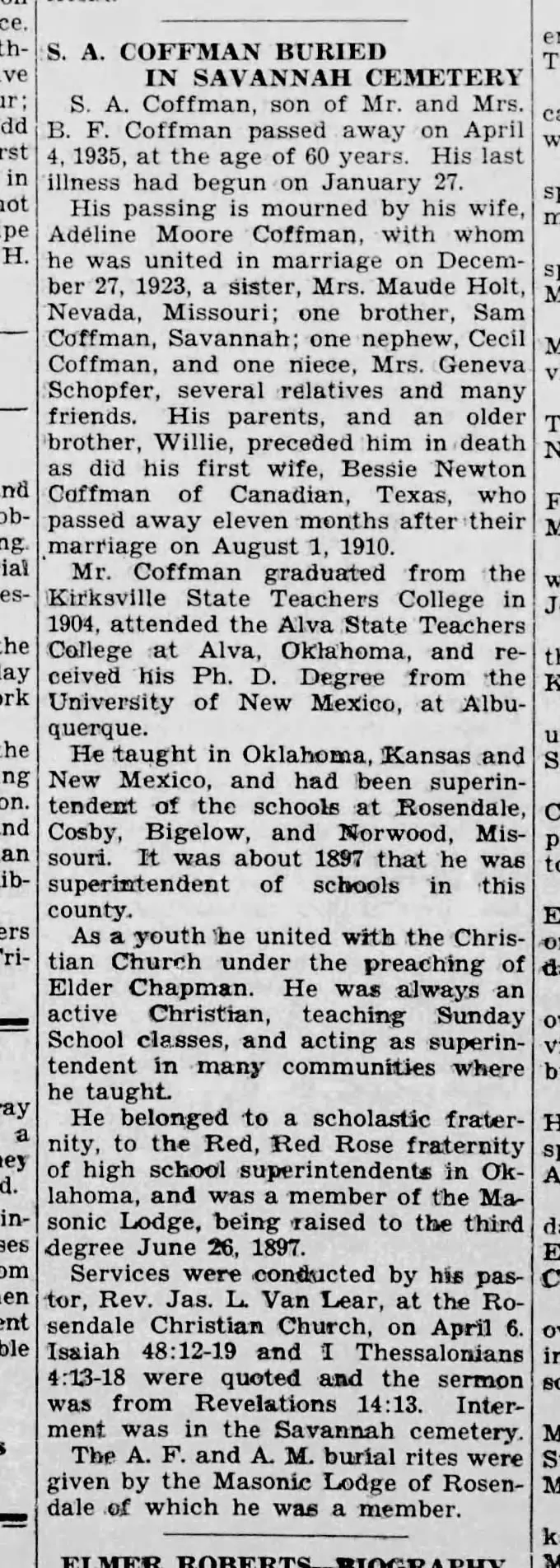 On December 27, 1923, Coffman again married, this time to Adeline Moore, in May, Oklahoma. Coffman was the superintendent of the high school, and Adeline was teaching English. She was a graduate of the Oklahoma normal school, and held a life certificate.