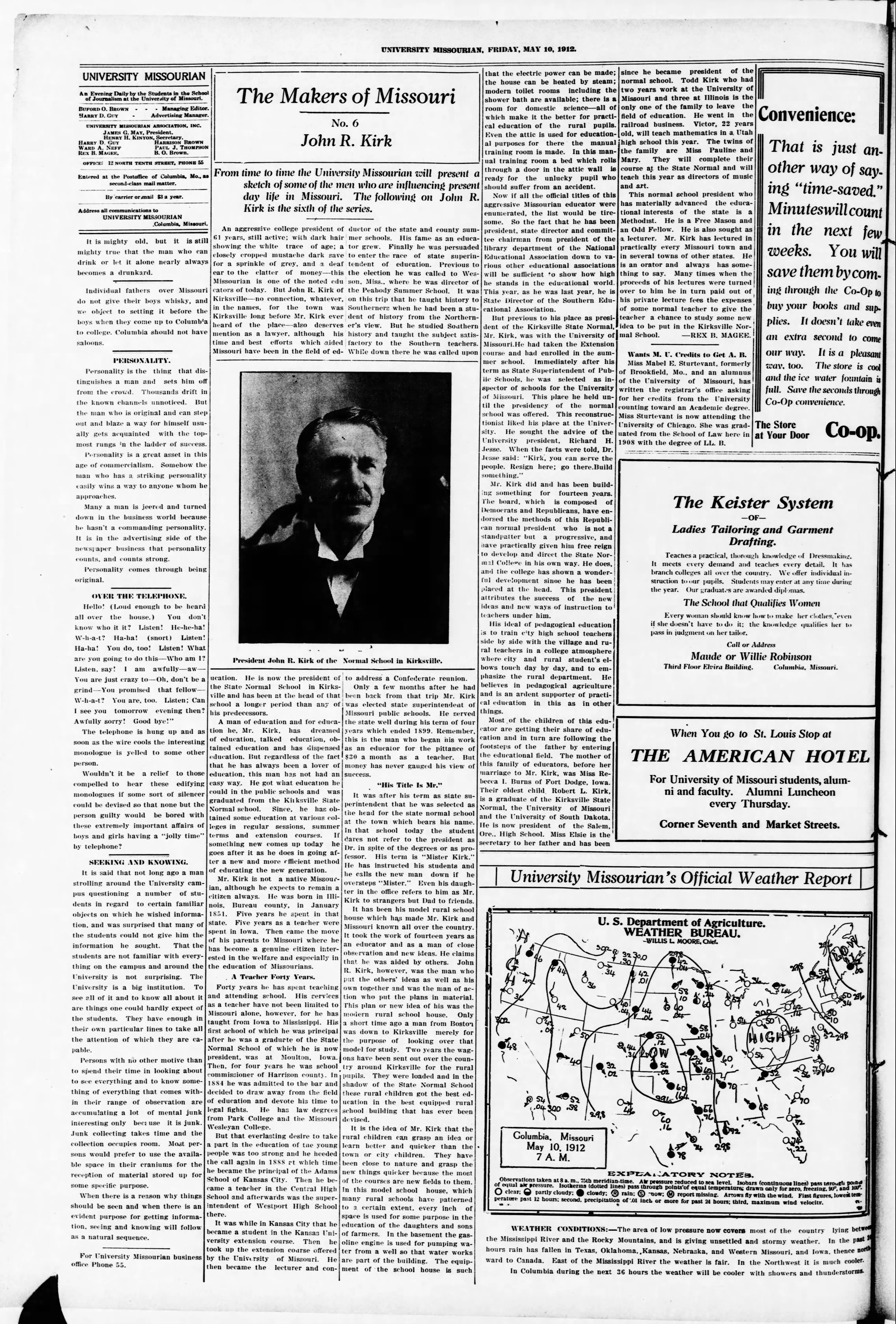 John Robert Kirk was born into a farming family in Illinois, moved to Missouri at age 5, and went into teaching. He was the president of the Kirksville school from 1899 to 1925, and was succeeded by one of his own students. In 1940, three years after his death, he was called "Missouri's grand old man of schools," by an Alumni publication of the Northeast Missouri State Teachers College, at the dedication of the John R. Kirk Memorial. The first quarter of the century saw him direct, with vigor, the growth of education in Missouri, and the nation.