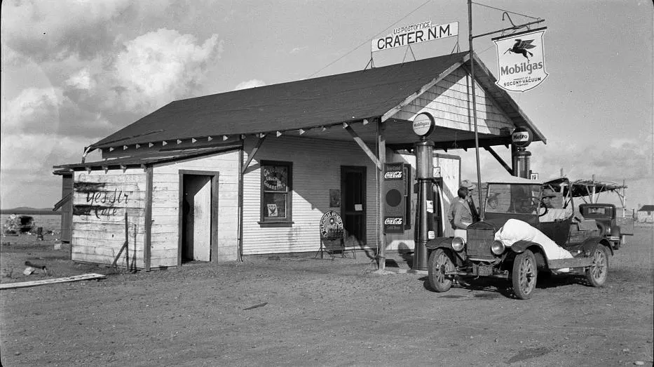Crater, New Mexico appears in historical lists of Dona Ana Post Offices. It was established on February 9, 1933, and was decommissioned on June 15, 1935. Benjamin Scott was the only Post Master, and he presumably owned the pictured Mobilgas filling station.