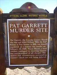Roadside sign near Pat Garrett murder site. Click for popup about Garrett's death.