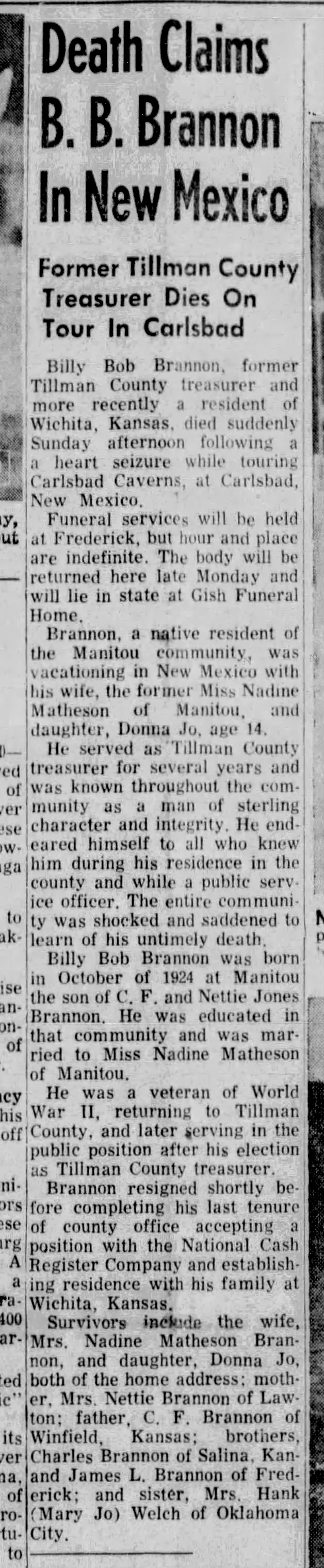 From Mr. Brannon's hometown newspaper we get further details. His name was "Billy Bob," he had a "heart seizure," he was born and educated in Manitou, Oklahoma, where he'd been County Treasurer for many years. He'd recently moved to Wichita to take a new job with National Cash Register. The local stories don't mention any last words at all, and certainly no words extolling the beauty of his place of death.